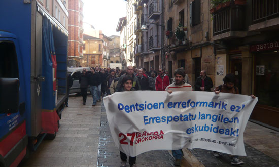 Gehiengo sindikalak deituta langile ugari batu da eguerdiko manifestazioan.San Ana plazatik abiatu dute protesta, 12:30ak pasata. 200 lagunetik gora ibili dira kalez kale grebarako deialdia eginez. Gaur, dagoeneko, greba bultzatzera eraman dituzten arrazoiak jendarteratu dituzte; megafonia eta panfleto bidez zabaldu dute aldarria. Landakon amaitu dute mobilizazioa.